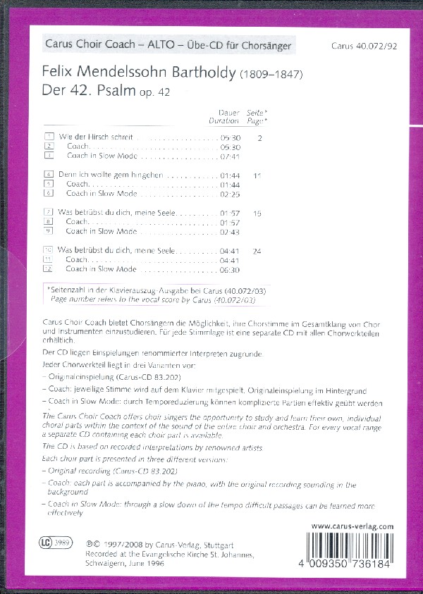 Carus Choir Coach Originaleinspielung Coach mit Klavierbegleitung (und Originaleinspielung im Hintergrund) Coach in Slow Mode (Temporeduzierung) Psalm 42