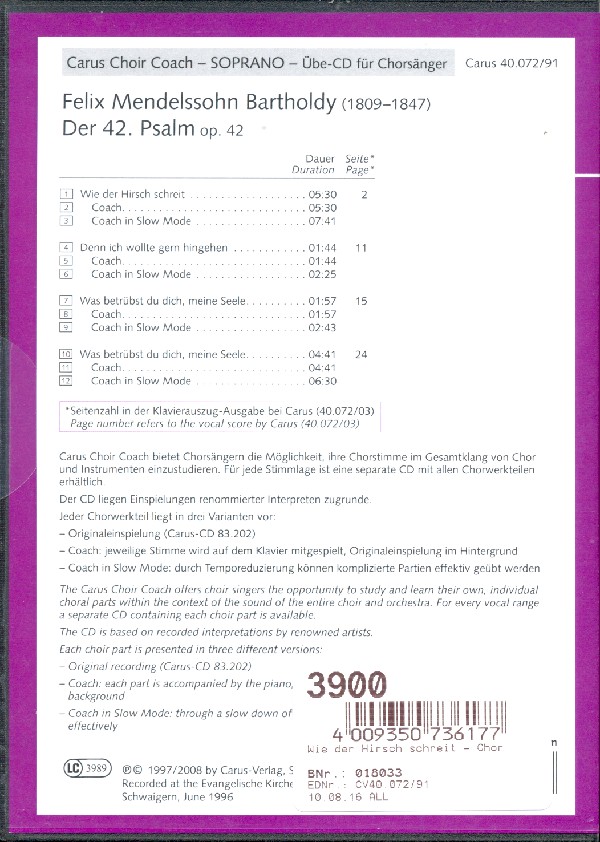 Carus Choir Coach Originaleinspielung Coach mit Klavierbegleitung (und Originaleinspielung im Hintergrund) Coach in Slow Mode (Temporeduzierung) Psalm 42