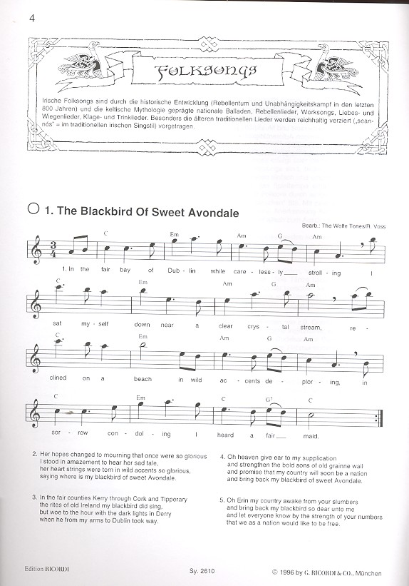 The Blackbird of sweet Avondale Ever the Winds The Cliffs of Dooneen The spanish Lady The dark eyed Sailor Only our Rivers Jack o' Donoghue Song of the Chanter I wish I were on yonder Hill You'll never deceive me again The Bally Desmond Polkas John Ryan's Polka Dennis Murohy's Polka St. Patrick's Day Three Sea Captains The Brosna Slide Cuil Aodha Slide Dingle Regatta Merrily kissed the Quakers Wife U.v.a.