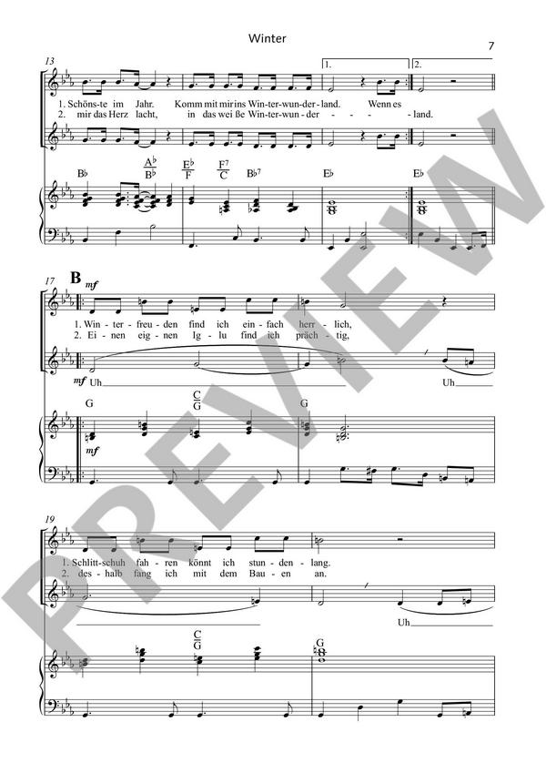 40 Winter- und Weihnachtslieder mit peppiger Begleitung warten auf ihre Aufführung. Viele bekannte, aber auch neue kindgerechte Lieder für große und kleine Auftritte des Kinderchors verschönern die winterliche, duftende Weihnachtszeit. Dabei kommen Winterlieder ebenso zum Einsatz wie Lieder zu St. Martin, Nikolaus, Advent und Weihnachten. Sie handeln von Schneeflocken, von Glöckchen, von Kerzen, von Engeln und natürlich von der Geburt Jesu. Wunderschöne Zeit Winterzeit, einfach herrlich Schneeflocken tanzen am Fenster vorbei Der Schneemann vor unserem Haus Hallo, kleiner Tannenbaum Viele Nächte hats gefroren Viele Flocken sind gefallen Ist der Winter da Wer hat schon mal sein Brot geteilt Lauter kleine Lichter strahlen Bald kommt der Nikolaus Kleine Glöckchen läuten fröhlich Nun ist es wieder bald so weit Lichterzeit, Freudenzeit Schmückt das Haus mit Tannenzweigen Wir freuen uns, es ist Advent Wir freuen uns am grünen Kranz Heute ist der erste Advent Machet die Tore weit Überall geschmückte Fenster Das helle Licht der Freude strahlt Kleine Kerzen leuchten Ganz leise klopft es an der Tür Auf dem Weg nach Bethlehem Mitten hier in unsrer Zeit Ein Kind ist heute geboren Ein Stern zeigt euch den Weg Welch ein himmlischer Gesang Gott macht sich zu uns Menschen auf Die Nacht war wie die andern Nächte Na, Josef, was hast du gedacht Noël: Ein Engel hat den Hirten heut Nacht Kommt mit zum Stall von Bethlehem Virgin Mary Had A Baby Boy Kommt, ruft es von den Bergen Wir stehen im Stall an der Krippe Wäre die Freude nur immer so groß Lichter leuchten in den Gassen Was heut geschieht, ist wie ein Traum Gott beschenkt uns, hört ihr Leute