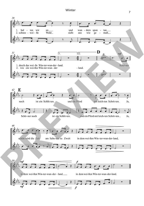 40 neue Winter- und Weihnachtslieder 40 Winter- und Weihnachtslieder mit peppiger Begleitung warten auf ihre Aufführung. Viele bekannte, aber auch neue kindgerechte Lieder für große und kleine Auftritte des Kinderchors verschönern die winterliche, duftende Weihnachtszeit. Dabei kommen Winterlieder ebenso zum Einsatz wie Lieder zu St. Martin, Nikolaus, Advent und Weihnachten. Sie handeln von Schneeflocken, von Glöckchen, von Kerzen, von Engeln und natürlich von der Geburt Jesu. Winter Wunderschöne Zeit Winterzeit-einfach herrlich Schneeflocken tanzen am Fenster vorbei Der Schneemann vor unserem Haus Hallo, kleiner Tannenbaum Viele Nächte hat's gefroren Viele Flocken sind gefallen Ist der Winter da / Jingle Bells / Dashing Through the Snow St. Martin Wer hat schon sein Brot geteilt Lauter kleine Lichter strahlen Nikolaus Bald kommt der Nikolaus Kleine Glöckchen läuten fröhlich Advent Nun ist es wieder bald soweit Lichterzeit-Freudenzeit Schmückt das Haus mit Tannenzweigen Wir freuen uns, es ist Advent Wir freuen uns am grünen Kranz Heute ist der erste Advent Machet die Tore weit Überall geschmückte Fenster Das helle Licht der Freude strahlt Kleine Kerzen leuchten Ganz leise klopft es an die Tür Weihnachten Auf dem Weg nach Betlehem Mitten hier in unsrer Zeit Ein Kind ist heut geboren Ein Stern zeigt euch den Weg Gloria! Hosanna in excelsis / Welch ein himmlischer Gesang Gott macht sich zu uns Menschen auf Die Nacht war wie die andern Nächte Na Josef, was hast du gedacht Noel-Ein Engel hat den Hirten heut Nacht Kommt mit zum Stall von Betlehem Virgin Mary Had A Baby Boy Kommt, ruft es von den Bergen Go, Tell It On the Mountain Wir stehen im Stall an der Krippe Wäre die Freude nur immer so groß Lichter leuchten in den Gassen Was heut geschieht, ist wie ein Traum Gott beschenkt uns, hört ihr Leute