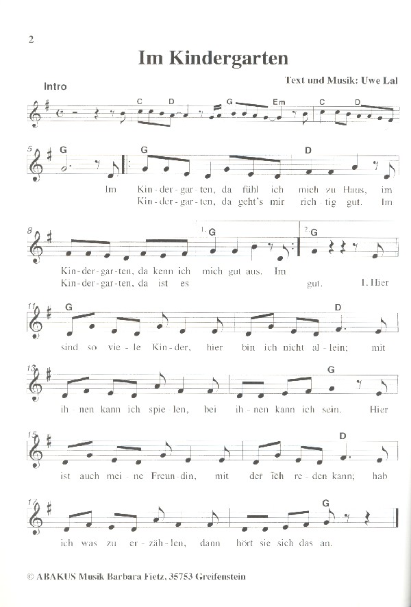 Im Kindergarten Weißt du was ich jetzt schon kann Wenn die Bayern tanzen Tiere können ganz schön viel Heute fehlt die Lisa Ihc bin jetzt schon drei Wenn ich endlich groß bin Papa ist ein Bauarbeiter Mein Teddybär Das klappt noch nicht Wir Kindergartenkinder Finger-Sportler-Lied Muntermacherlied Ich bin ein tierisch guter Sportler Heut ist meine Oma im Kindergarten Komm wir wolln zusammen spielen Sag bitte nicht ich kann das nicht