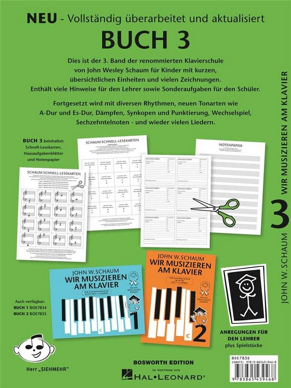 Klavierschule vollständig überarbeitete und aktualisierte Neuausgabe von BOE3509 Für Kinder von 7-11 Jahren Die seit Jahrzehnten außerordentlich erfolgreiche Klavierschule von John Wesley Schaum liegt erstmals in einer vollständig überarbeiteten Neuauflage vor. Die Texte wurden an die neue Rechtschreibung angepasst, die Illustrationen modernisiert und jedem Band zur Wiedererkennung eine Farbe zugeordnet, die ihn vom schwarz-weißen Vorgänger abhebt. Die Methode überzeugt weiterhin mit der Übersichtlichkeit der Lehreinheiten, den ergänzenden Abbildungen, wertvollen Hinweisen für die Lehrerinnen und Lehrer sowie Sonderaufgaben für Schülerinnen und Schüler. Vor allemdurch die kurz gehaltenen Übungen und einfachen Melodien zu Beginn kommen die jungen Klavierspieler schnell zu den ersten Lernerfolgen und die Motivation zum Weitermachen wird natürlich gesteigert. Für Klavierschüler im Alter von 7 11 Jahren. Der dritte Teil ergänzt das Erlernte um diverse Rhythmen sowie weitere neue Tonarten (A-Dur, Es-Dur) und behandelt Dämpfen, Synkopen und Punktierung, Wechselspiel und Sechzehntelnoten. Das reichhaltig vorhandene Spielmaterial hilft dabei, die Lektionen zu vertiefen.