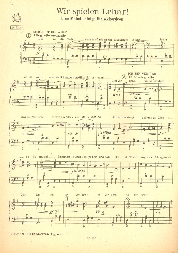 SCHOEN IST DIE WELT ICH BIN VERLIEBT NAPOLITANA WARUM HAT JEDER FRUEHLING MAEDEL KLEIN MAEDEL FEIN SCHOEN SIND LACHENDE FRAU'N WAS GEH'N MICH AN DIE LEUTE LIEBE DU HIMMEL AUF ERDEN IMMER NUR LAECHELN DEIN IST MEIN GANZES HERZ ZORIKA ZORIKA KEHRE ZURUECK MEINE LIPPEN SIE KUESSEN SO HEISS DIE WELT BEKRAENZT SICH MIT ROSEN WOLGALIED NECHLEDIL-MARSCH