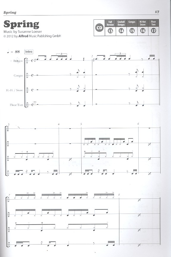 Wood Grooves Percussion Spring African Spirit Palmas Triple Punch Cuba Drum & Bass World of Rhythm ist aus der praktischen Arbeit mit verschiedenen Ensemblegruppen entstanden. Die Titelauswahl ist das Ergebnis dieser Ensemblearbeit und deckt eine stilistische Bandbreite ab, die sich in der Musikschulpraxis bewährt hat. Von Pop über Latin bis hin zu Drum & Bass werden die für die Percussionmusik relevanten Grooves abgedeckt. Jedes einzelne Stück ist ideal geeignet für Musikschulvorspiele, Auftritte und Wettbewerbe. Alle Stücke sind speziell für das gleichzeitige (!) Zusammenspiel von Anfängern und Fortgeschrittenen geeignet, also für heterogene Gruppen mit unterschiedlichen spieltechnischen Voraussetzungen und Kenntnissen, komponiert für rein rhythmusbezogene Percussioninstrumente und Drumset für Gruppen bis zu acht Drummern. Die Play-along CD im mp3-Format enthält neben den Demo-Tracks des kompletten Rhythmusensembles auch sogenannte Minus-One-Auf-nahmen, in denen je eine einzelne Stimme zum Mitspielen weggelassen wurde. Mit World of Rhythm werden Musikschüler spielerisch an die unterschiedlichen Kleinpercussion-Instrumente herangeführt. Das verwendete Instrumentarium orientiert sich an der Schlagwerkgrundausstattung der Musikschulen, so dass keine zusätzlichen Instrumente in der Musikschule angeschafft werden müssen. Damit ist diese Zusammenstellung ideal geeignet für den Unterricht für Schlagzeug- und Percussionensembles in Musikschulen. Claus Hessler zu diesem Buch: Mit den vorliegenden Stücken lässt sich der Musikschulalltag ganz sicher abwechslungsreicher und spannender gestalten, die Arrangements enthalten jede Menge Anregungen für die Unterrichtsgestaltung ... und die nächsten Vorspielabende sind garantiert gerettet! Mit gängigem Instrumentarium werden diverse Grooves in unterschiedlichen Tempi geschickt kombiniert, so dass auch das Zusammenspiel von Schülern verschiedener Levels kein großes Problem sein sollte. Ein Buch, das in jeden Musikschultempel gehören sollte!