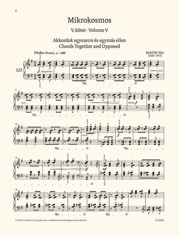 Bartók's Mikrokosmos has been one of the milestones in pedagogical piano repertoire for 80 years - and yet it is also far more than a 'classical' piano primer. These 153 piano pieces, organized in ascending order of difficulty, engage not only with technical aspects of piano playing but also with the fundamentals of composition - from 'Imitation and Inversion,' 'Ostinato,' and 'Free Variations,' concerning compositional technique, to mood pieces and pieces with programmatic ideas such as 'Notturno,' 'Boating,' 'From the Diary of a Fly,' or the famous 'Six Dances in Bulgarian Rhythm.' Mikrokosmos first appeared in 1940 in six volumes. Based on volume 40 of the Bartók Complete Edition published in 2020, the present Urtext edition offers the series gathered in three volumes. This edition includes Bartók's preface, exercises, and notes written for the first edition. Furthermore, it also features a preface and comments by the editor, which not only discuss the genesis and the compositional sources but also provide performers, teachers and pupils alike, with authentic and detailed information about Bartók's notation and the specific performing problems of Mikrokosmos.