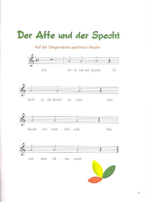 Mit den Tierliedern können Violinanfänger bereits von der ersten Unterrichtsstunde an richtige Lieder mit Klavierbegleitung spielen und singen. Zunächst sind nur leere Saiten und der Bogen nötig, ab dem Hamster-Weihnachtslied wird auch der für die richtige Intonation und Handhaltung besonders wichtige erste Finger herangezogen. Die lustigen Liedertexte und die wunderschönen Illustrationen sind nicht nur pädagogisch wertvolles Unterrichtsmaterial, sondern auch ein heiterer Einstieg in den Violinunterricht! Das Heft mit Bildern enthält die Violinstimme für Kinder, die komplette Fassung der Lieder mit Text, Melodie und Violinstimme findet sich in der beigelegten Klavierpartitur. Der Affe und der Specht Das Schnurr-Lied Der kugelrunde Brummi-Bär Die Eule und der Esel Die fleißige Biene Tausendfüßler Johann Müller Rosa Schwinchen Rosa Das Hamster-Weihnachtslied Regenwürmchen namens Paul Der Hase kulidu Zwei Mäuse und die Katze Dumbo Die Mücke und der Doktor Das Muttertag-Lied