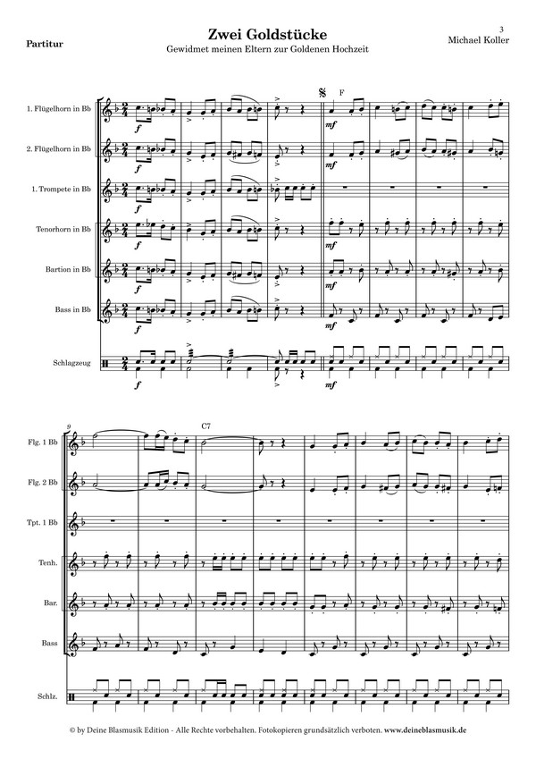 Der österreichische Musiker und Komponist Michael Koller widmet die Polka 'Zwei Goldstücke' seinen Eltern, die bereits seit mehr als 50 Jahren gemeinsam durchs Leben gehen. Entstanden anlässlich ihrer goldenen Hochzeit, zeichnet der Autor musikalisch liebevoll ihren Lebensweg.