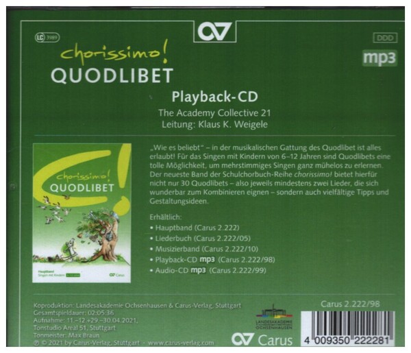 Brecht, Klaus, ed Weigele, Klaus K., ed für Kinder und Jugendliche von 6 bis 12 Jahren 30 Quodlibets 'Wie es beliebt' in der musikalischen Gattung des Quodlibet ist alles erlaubt! Das Grundprinzip: Liedmelodien mit gleichem harmonischen Verlauf werden nicht nacheinander, sondern gleichzeitig gesungen. Aus dem Zusammenklang entstehen neue Musikstücke und eigene, vorher ungeahnte Spannungsmomente! Für das Singen in der Schule sind Quodlibets besonders für Kinder und Jugendliche von 6 bis 12 Jahren eine tolle Möglichkeit, um mehrstimmiges Singen ganz mühelos zu erlernen. Der neueste Band der Schulchorbuch-Reihe chorissimo! bietet hierfür nicht nur 30 Quodlibets also jeweils mindestens zwei Lieder, die sich wunderbar zum Kombinieren eignen sondern auch vielfältige Ideen, Tipps und Anregungen. Der Aufbau der Mehrstimmigkeit, Probenmethoden, kreative Umsetzungsideen im Raum und Bewegungsideen werden genauso thematisiert wie leichte Begleitmodelle für Stabspiele. Die Quodlibets setzen sich meist aus einem traditionellen Lied und einem neuen, thematisch passenden Lied zusammen. Sie sind thematisch gegliedert in fünf Kapitel: Lieder für den Alltag, Jahreszeiten, Weihnachtslieder, Lieder in anderen Sprachen und Spaßlieder. Maria durch ein Dornwald ging Leise rieselt der Schnee Old Mac Donald had a farm Der Mond ist aufgegangen Hey und Hallo / Bye, au revoir Wann und wo Lasst uns tanzen Glückauf im neuen Jahr Rätsellied Rechenlied ABC-Lied Wir gratulieren zum Geburtstag Rundadinella Kennst du die Jahreszeiten? Frühling lässt die Sonne scheinen Kleiner Schmetterling Hurra, der Sommer ist da! Der Herbst ist gekommen Im Walde, da wachsen die Beer'n Heute hat's geschneit Winter, zieh wieder davon! Hei! Hurra! Welche Freude! Weit durch die Nacht Siehst du das Licht der Kerzen Klöpfeleslied Wer bringt die Geschenke Ein Mops mit Namen Ottokar Three little kittens Tanzt, ihr Marionetten! Ainsi font, font, font Der musikalische Bauernhof Schütteln wir den Apfelbaum! Shake, shake the apple-tree Fröhlich sei das Mittagessen Entendez vous le carillon The little bells at Westminster Es war eine Mutter / Kennst du die Jahreszeiten Im Zwergenland geht's lustig zu Fitness-Tanz der Geister Mein Opa ist ein optimaler Typ Row your boat Weihnachten steht vor der Tür Wann und wo? / Hey und hallo / Bruder Jakob Glückauf im neuen Jahr / Lasst uns tanzen, lasst uns singen Grün, grün, grün sind alle meine Kleider / Rätsellied / Salibonani Der Mond ist aufgegangen / Herr, bleibe bei uns ABC-Lied / Rechenlied Rundadinella / Wir gratulieren zum Geburtstag Entendez vous le carillon / Fröhlich sei das Mittagessen / The little bells Alle Vögel sind schon da / Frühling lässt die Sonne scheinen Hopp, hopp, hopp / Kleiner Schmetterling Trarira, der Sommer, der ist da / Hurra, der Sommer ist da Im Walde da wachsen die Beer'n / Der Herbst ist gekommen A, a, a, der Winter, der ist da / Heute hat's geschneit Ach bittrer Winter / Winter, zieh wieder davon Schneeflöckchen, Weißröckchen / Hei! Hurra! Welche Freude Leise rieselt der Schnee / Weit durch die Nacht Klöpfeleslied / Siehst du das Licht der Kerzen Morgen, Kinder wird's was geben / Wer bringt die Geschenke? Licht der Weihnacht / We wish you a merry Christmas Licht der Weihnacht Shalom chaverim / Weihnachten steht vor der Tür Maria durch ein Dornwald ging / Eyja ja Three little kittens / Ein Mops mit Namen Ottokar Ainsi font, font, font / Tanzt, ihr Marionetten! Old Mac Donald had a farm / Der musikalische Bauernhof Shake, shake, shake the apple tree / Schüttlen wir den Apfelbaum Row your boat / La mar estaba salada Es tanzt ein Bi-Ba-Butzemann / Im Zwergenland geht's lustig zu Jimba, jimba / Fitness-Tanz der Geister Meine Oma fährt im Hühnerstall Motorrad / Mein Opa ist ein optimaler Typ Augustin im Stadtgespräch Augustin in der Natur Augustin beim Tanz Bruder Jakob / Frère Jacques Grün, grün, grün sind alle meine Kleider Herr, bleibe bei uns Es war eine Mutter Alle Vögel sind schon da Hopp, hopp, hopp Trarira, der Sommer, der ist da A, a, a, der Winter, der ist da Ach bittrer Winter Schneeflöckchen, Weißröckchen Morgen, Kinder, wird's was geben Shalom chaverim La mar estaba salada Es tanzt ein Bi-Ba-Butzemann Jimba, jimba Meine Oma fährt im Hühnerstall Motorrad O, du lieber Augustin