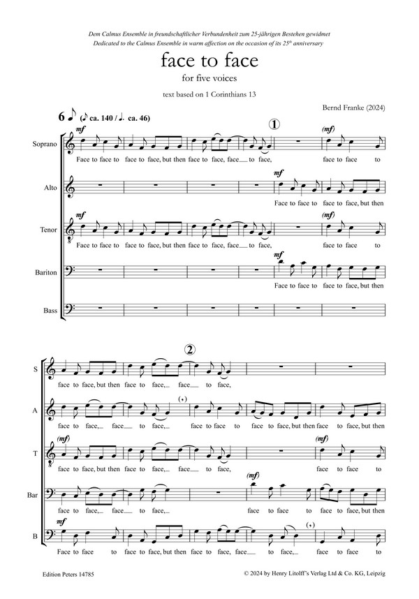 My new work for the CALMUS Ensemble was commissioned for their 25th anniversary and continues a very intensive and successful collaboration following my composition And why?. Since its premiere, And why? has had over 100 performances worldwide on several continents, so I was very familiar with the qualities of the ensemble. The text is based on the Song of Songs from the 13th chapter of 1 Corinthians by Paul of Tarsus and deals with the theme of love for one's neighbour, a very topical and timeless theme in the history of mankind. Compositionally, a main theme (face to face) returns again and again in a rondo-like manner and, with its tonal material, also forms the basis for constantly varying sound structures.'