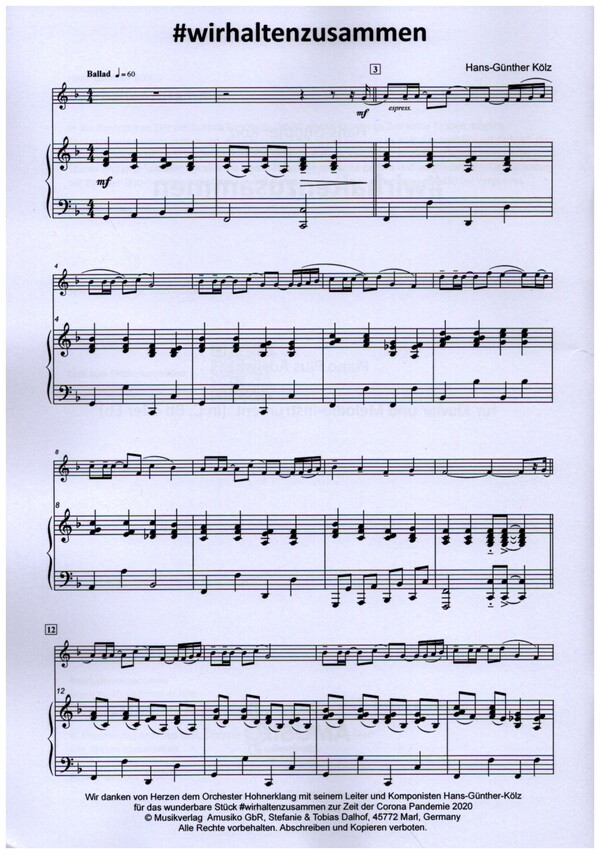 Diese wunderbare Ballade ist in einer besonderen Zeit entstanden. Das Orchester Hohnerklang mit seinem Dirigenten und Komponisten Hans-Günther Kölz hat das Stück mit einem Videoprojekt uraufgeführt.