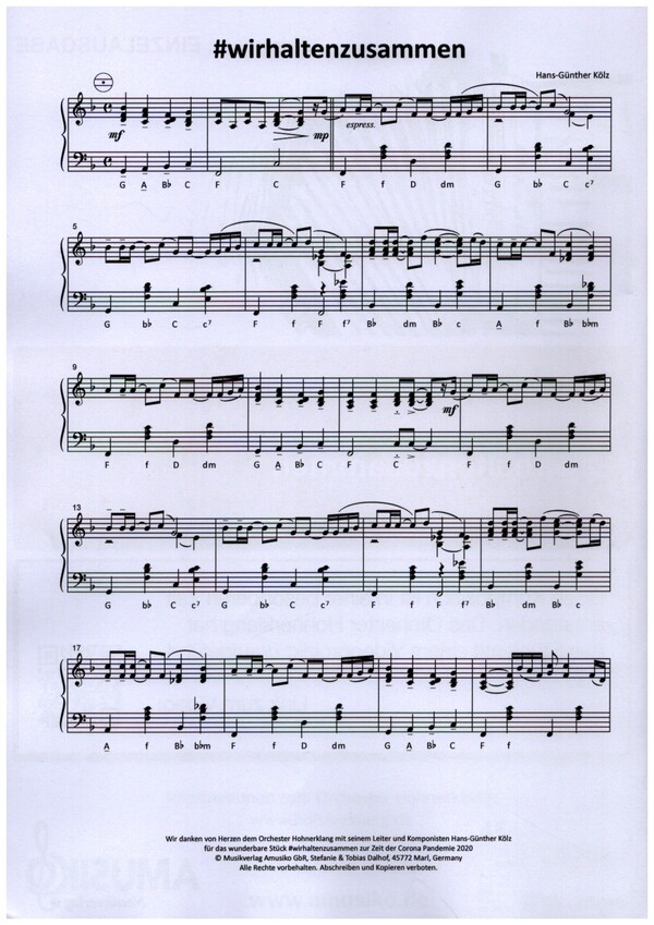 Diese wunderbare Ballade ist in einer besonderen Zeit entstanden. Das Orchester Hohnerklang mit seinem Dirigenten und Komponisten Hans-Günther Kölz hat das Stück in der Akkordeon-Orchester-Version mit einem Videoprojekt uraufgeführt. Diesen Artikel gibt es auch als Download-Artikel. Sie können ihn runterladen und die Noten sofort mit Ihrem Drucker ausdrucken und losspielen.